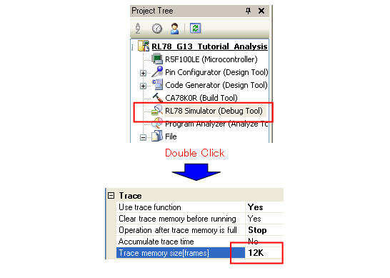 As shown in the figure below, in the debugging tool properties, change the "Trace memory size" setting to 256K, then from the menu, click the [Reset & Run] button.