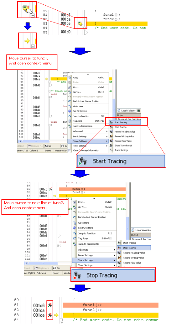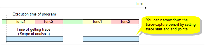 Now, remove the breakpoint from the main routine as shown below, and narrow down the target of analysis. In order to do this, set the trace-capture segment to the func1 and func2 execution segments only.