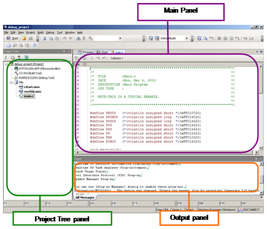 Main panel : Displays the panel (Device Top View panel, Code Generator panel, etc.) corresponding to the function selected in the Project Tree.