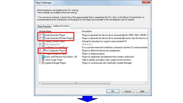 In the default setting of CS+, the Pin Configuration and Code Generating functions are not available.