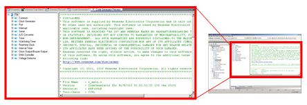 You can confirm the content of the program that will be generated without actually generating the code. This is called a "Code Preview" function. Try this function by selecting [Code Generator Preview] from the [View] menu. "Code Preview" is sometimes shown by the kind of microcontroller in the Project Tree.