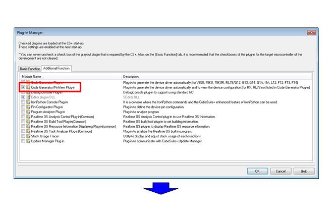 In the default setting of CS+, the Code Generating functions are not available.