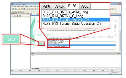 Select the item including "Analysis_Tutorial" from [RL78] tab in [Open Sample Project], and click [GO] button. |