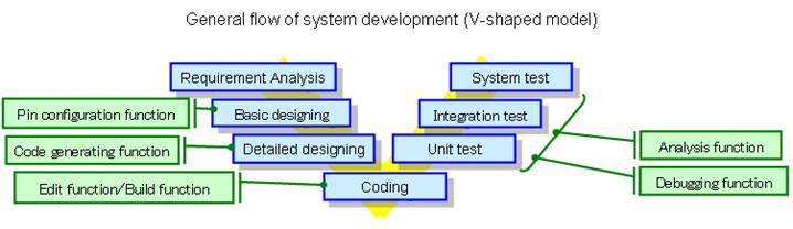 In general, the process of system development follows a "V" shaped model. The features provided by CS+ correspond to this model as follows: