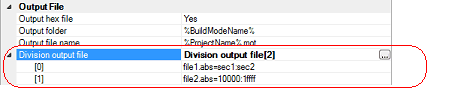The setting of the hex file output range is made with the [Division output file] property in the [Output File] category.