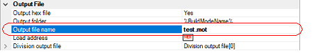 Enter the hex file name to be changed to in the [Output file name] property in the [Output File] category.