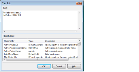 Specify the division output file name in [Text] in the format of "file name=start address-end address" (start address, end address: The start address and end address of the output range) or "file name=section name" (section name: The name of the output section), with one file name per line.