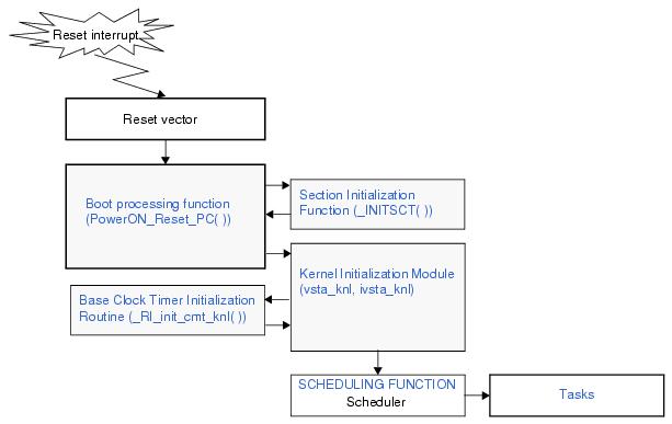 The kernel initialization module is executed by calling vsta_knl, ivsta_knl. Generally, vsta_knl, ivsta_knl is called from the Boot processing function (PowerON_Reset_PC( )).