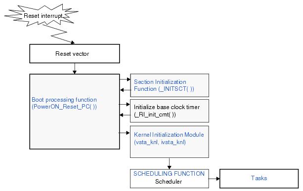 The kernel initialization module is executed by calling vsta_knl, ivsta_knl. Generally, vsta_knl, ivsta_knl is called from the Boot processing function (PowerON_Reset_PC( )).
