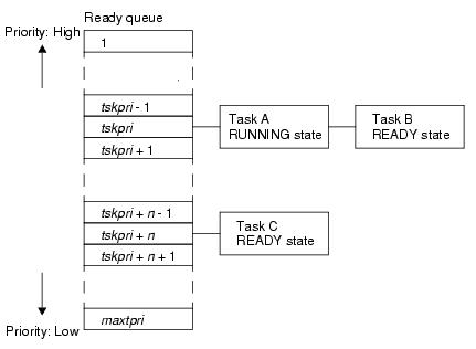 The ready queue is a hash table that uses priority as the key, and tasks that have entered an executable state (READY state or RUNNING state) are queued in FIFO order. Therefore, the scheduler realizes the RI600V4's scheduling method (priority level or FCFS) by executing task detection processing from the highest priority level of the ready queue upon activation, and upon detection of queued tasks, giving the CPU use right to the first task of the proper priority level.