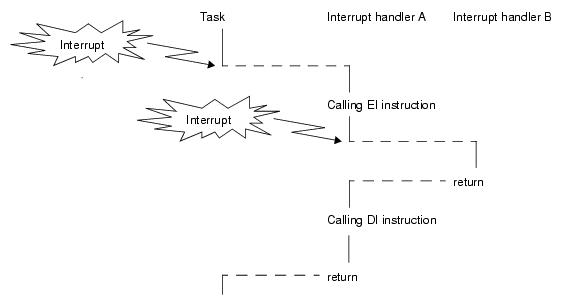 Execution of interrupt handler is started in the interrupt disabled state (the ID flag of the program status word PSW is set to 1). To generate multiple interrupts, processing to cancel the interrupt disabled state (such as issuing of EI instruction) must therefore be coded in the interrupt handler explicitly.