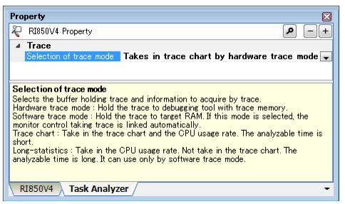 The trace information file (file name: trcinf.c) includes descriptions of the processing necessary for the trace mode selected in the Property panel -> [Task Analyzer] tabbed page -> [Trace] category -> [Selection of trace mode].