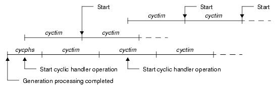 The relative interval from when either of this service call is issued until the first activation request is issued varies depending on whether the TA_PHS attribute is specified for the target cyclic handler during configuration.