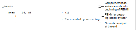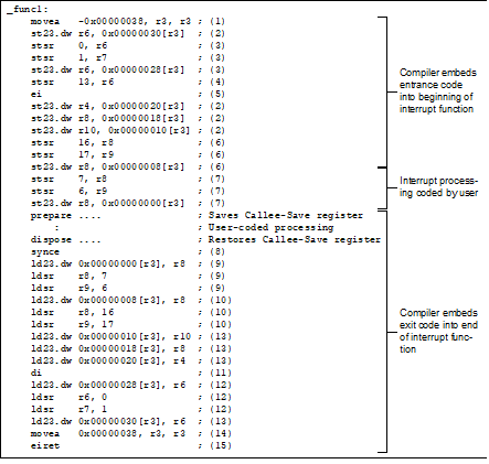 However, this is not inserted into all interrupt functions. Necessary processing is output in accordance with user-defined #pragma statements, compiler options, etc.