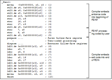 The compiler inserts the following instructions at the entrance and exit of an EI level exception interrupt function. EIINT and FPI are some of the main corresponding items.