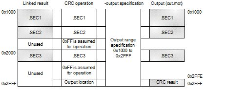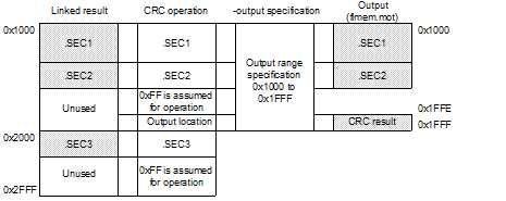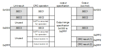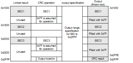 When the -space option is not specified and the operation range includes an empty area that is not output, 0xFF is assumed to be stored in the unused area during CRC operation.