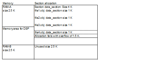 The RAM is split to RAM-A (size 2.5 K) and RAM-B (size 2.5 K), and data_section (size 4 K) of the combined file1.obj, file2.obj, file3.obj, and file4.obj cannot be allocated as shown below.