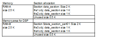 When STRIDE_DSP_MEMORY_AREA is specified, data_section (size 2 K) of file1.obj and file2.obj is allocated to RAM-A (size 2.5 K), and then data_section (size 2 K) of file3.obj and file4.obj is allocated to RAM-B (size 2.5 K), as shown below.