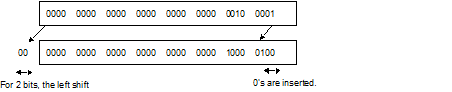 Zeros equivalent to the specified number of bits shifted move into the low-order bits.