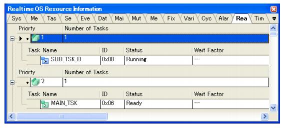 This tab displays the ready queue information (e.g. Priority and Task Num) of the RI600PX.