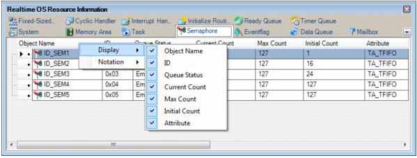 To select which items are displayed, right click on the header (header column or row) in the Realtime OS Resource Information panel, and from the context menu that appears, select "Display".