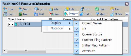 To select which items are displayed, right click on the header (header column or row) in the Realtime OS Resource Information panel, and from the context menu that appears, select "Display".
