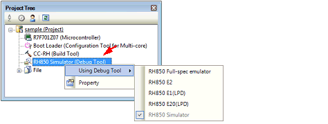 To select or switch the debug tool, use the context menu shown by right clicking on the [RH850 Debug tool name (Debug Tool)] node on the Project Tree panel.