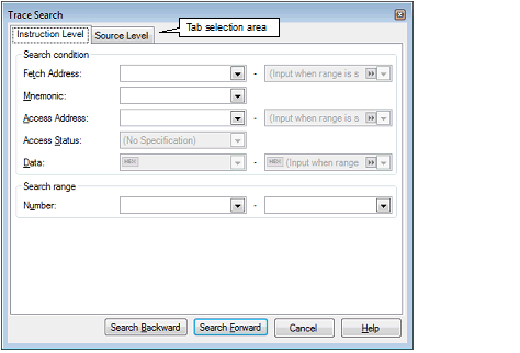 Note that by selecting the appropriate tab in this dialog box, you can choose to search for trace data at the instruction level or search at the source level.