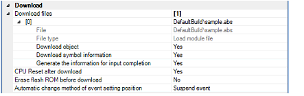 By default, CPU reset automatically occurs after downloading the file, and then the program is executed to the specified symbol position. If this operation above is not needed, specify [No] with both of the [CPU Reset after download] and [Execute to the specified symbol after CPU Reset] property.