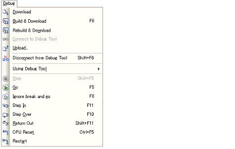 Items of the debug toolbar and the [Debug] menu are valid only while connected to the debug tool. |