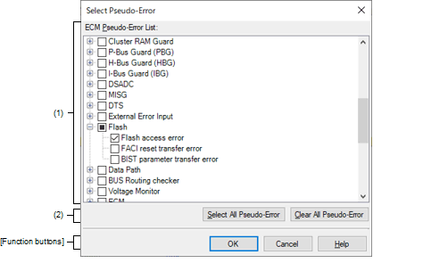 This dialog box is used to select ECM pseudo-errors displayed in the Pseudo-Error Debugging panel [Full-spec emulator][E1][E20].