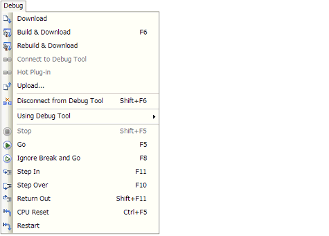 Items of the debug toolbar and the [Debug] menu are valid only while connected to the debug tool. |