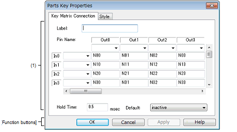 This property dialog box is used to set or change the pin connection information of a key matrix, which is one of the connection parts in the I/O Panel window.