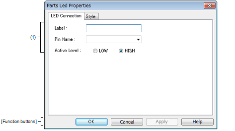 This property dialog box is used to set or change the pin connection information of LED, which are one of the connection parts in the I/O Panel window.