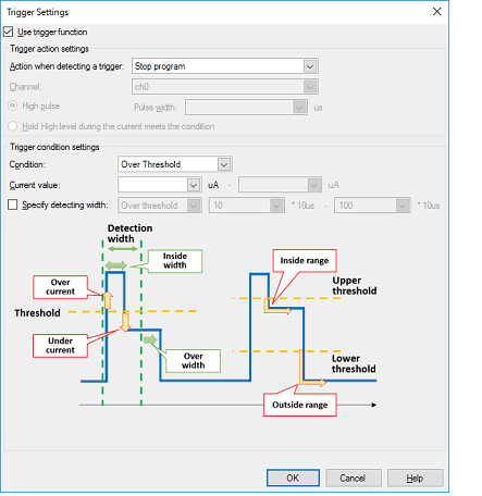 As well as the condition for the current value, a sub-condition (condition for the detection width) regarding the time over which the condition is satisfied can be set. Specifying a width for detection can eliminate the detection of noise that temporarily satisfies the condition.