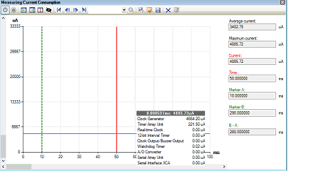 When current consumption is measured on the simulator, the current values in the MCU are simulated and displayed.