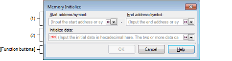 Specify an address range of memory whose values need to be initialized in [Start address/symbol] and [End address/symbol]. Enter address expressions directly in the respective text boxes (specifiable in up to 1,024 characters) or select an input history item from the drop-down list (up to 10 history entries).