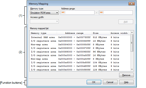 When the simulator is in use, you cannot add memory mappings to the areas that overlap the following memory types. (A message will appear if you click [Add] button in these areas.)