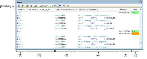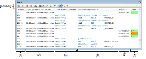 This panel displays the trace data which has had an execution history of the program recorded in it (see "2.13 Collecting an Execution History").