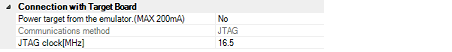 Depending on the length or the method of JTAG signal wiring on the target system, it may not be possible to communicate using the selected JTAG clock. In such a case, reducing the JTAG clock may achieve successful communication. |