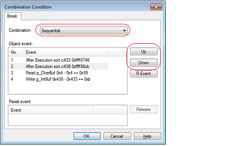 Change the order of events in the Object event list using the [Up] or [Down] button. These buttons are enabled only when you've selected Sequential for the combination condition and moved the caret to an event in the Object event list.