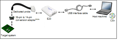 For more details on the connection using a 38-pin to 14-pin conversion adapter, see E20 User's Manual