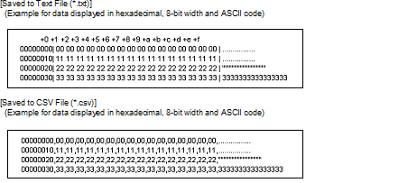 It is possible to save a specified range of memory contents to a text file (*.txt) or a CSV file (*.csv).