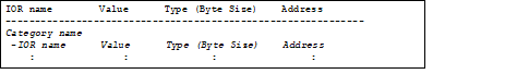 By choosing [Save IOR Data As...] from the [File] menu, it is possible to open the Save As dialog box and then save the contents of I/O registers in whole to a text file (*.txt) or a CSV file (*.csv) (Regardless of whether you've chosen to show or not show on this panel, the values of all I/O registers are saved.).