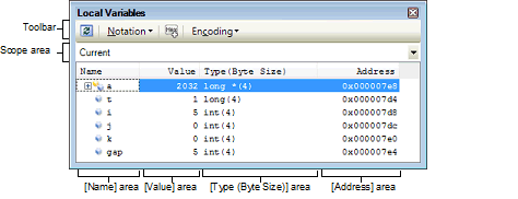 For details on how to read each area and details about their functionality, see the section where the Local Variables panel is described.