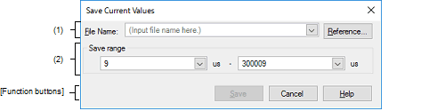Specify the range in time of values for current to be saved by specifying the times (in microseconds) where saving is to start and end. The numbers are decimal.