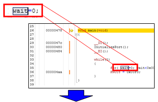 By registering a variable to the watch window, it is possible to display the value of that variable. In this section, you register a global variable called "wait" to the watch window and confirm that the value of the variable is incremented using a software break. The "wait" that is defined as a global variable which uses it as a timer use and counts up about 1 second (from H'0 to H'80000).