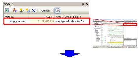 See the Watch panel and confirm that the value of [g_count] is counted up to 1. |