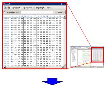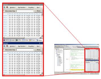 The Memory panel displays the state of memory. In this example, we display two of the four Memory panels. If [Memory 1] and [Memory 2] are displayed at the same time, they are tabbed by default, making it impossible to view the both panels at same time. Let's dock these two panels so that they can be viewed together.
