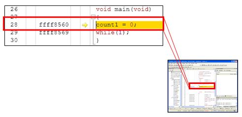 A program counter (PC) is a control register that holds information on the next program address. When the RX600 Series generates a reset signal, PC is set to the reset vector address FFFFFFFCH and FFFFFFFFH.In the program of this tutorial, address FFFF8000H is set after resetting. In the default setting of CS+, C source code is displayed after running the program from the reset address to the beginning of the main function when the Reset button is pressed in order to enhance the efficiency of program development using the C source code. You can change this behavior by [Download File Setting] tab in the Debug Tool Property.